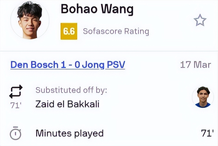 据SofaScore赛后评价,王博豪总计有32次触球,传球成功率为71%,而他在左路的拼抢非常积极,总计11次对抗,8次空中争顶有3次取得成功。此外,他不仅在左路本方半场防守,而且还跑到了对方禁区协助队友进攻,活动范围非常大。从这场比赛来看,王博豪不遗余力地奔跑了71分钟,体能方面没有太大问题,这点也让人感到非常欣喜。